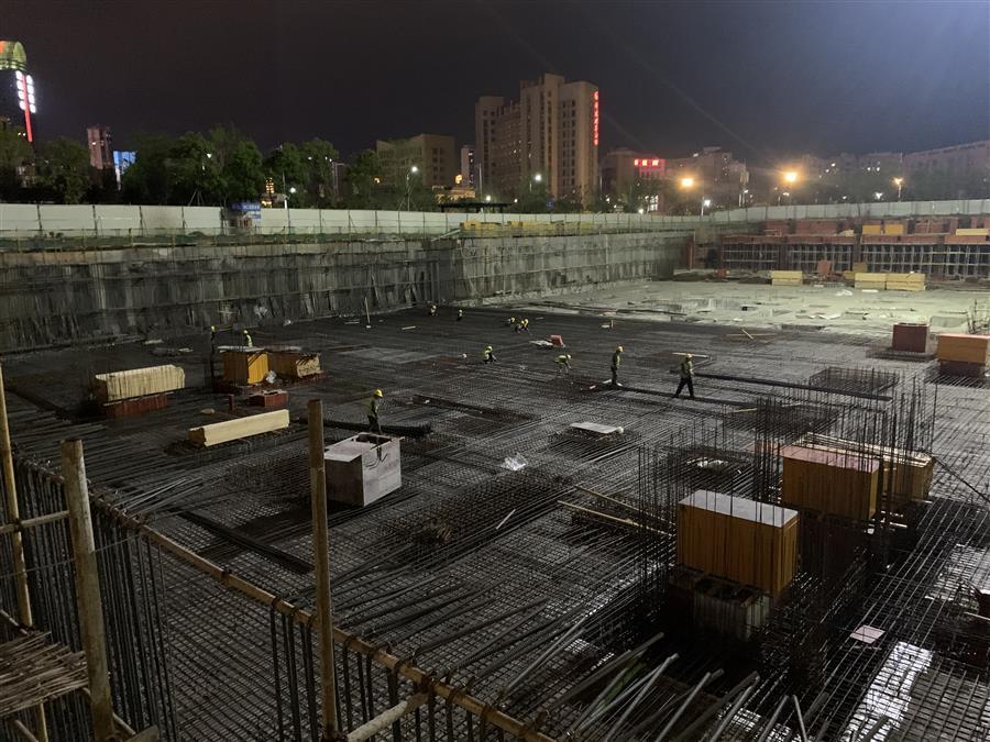 時至深夜,贛州市人民醫(yī)院新院職工交流房項目工作人員依舊奮戰(zhàn)在施工現(xiàn)場,現(xiàn)場機械轟鳴聲、焊接切割聲交織在一起,一片熱火朝天的大干景象。目前,130余名施工作業(yè)人員全面鋪開各個工作面,底板防水施工、承臺鋼筋綁扎、磚胎膜砌筑、樁頭破除、地下室頂板架子搭設(shè)和模板安裝等工作都在有序推進(jìn),各班組都在按照計劃加班加點推進(jìn)項目建設(shè)進(jìn)度。