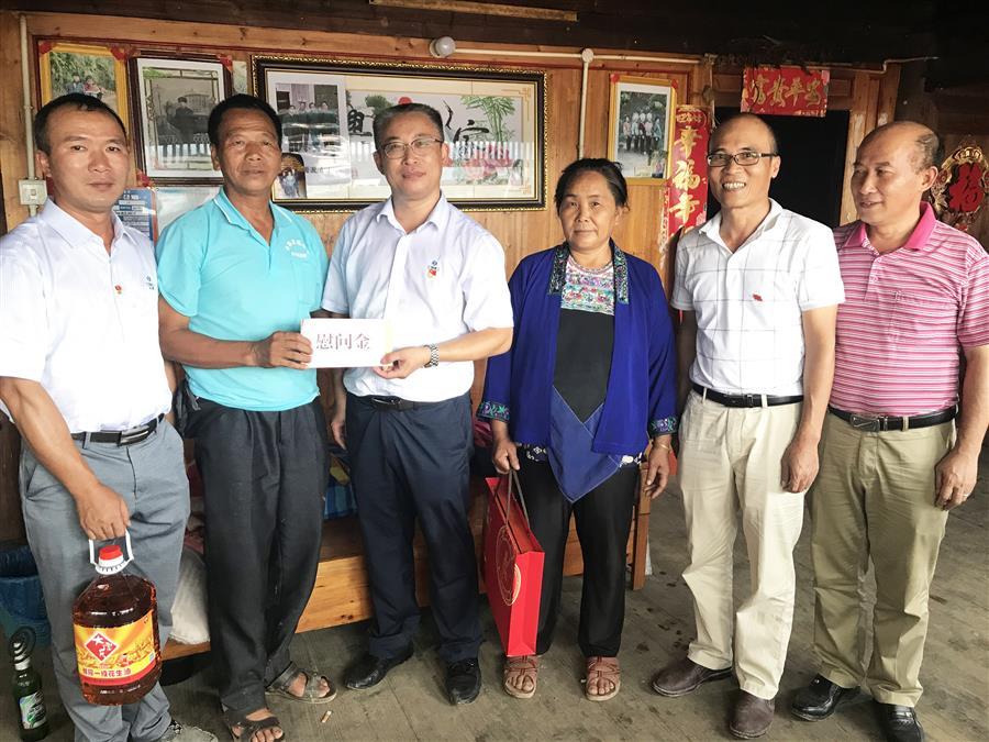 烏杠屯地處深山,道路崎嶇,許多貧困戶的家無(wú)法通車(chē),一公司慰問(wèn)小組肩扛大米、手提花生油等物資,一路步行上山,將慰問(wèn)品一戶戶送到貧困戶手中。