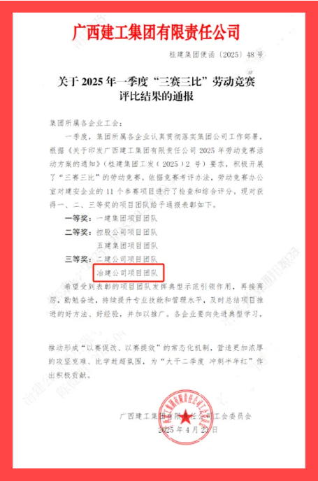 4月23日,集團公司工會通報2025年一季度“三賽三比”勞動競賽評比結(jié)果,冶建公司項目團隊在11個建安企業(yè)參賽項目中榮獲三等獎,彰顯了項目團隊務實高效、團結(jié)協(xié)作、拼搏進取的精神風貌。